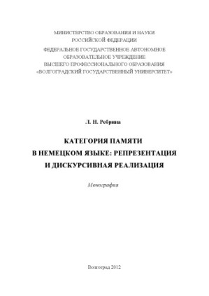 Категория памяти в немецком языке: репрезентация и дискурсивная реализация: монография Л. Н. Ребрина; М-во образования и науки Российской Федерации, Федеральное гос. авт. образовательное учреждение высш. проф. образования "Волгоградский гос. ун-т" Издат. Волгоградского Государственного Унив, Naučnoe izd, Volgograd, 2012