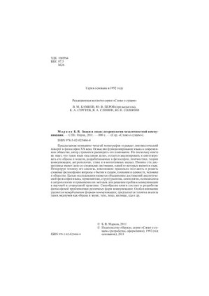 Предлагаемая вниманию читатей монография отражает лингвистический поворот в философии ХХ века. Осмысляя функционирование языка в современном обществе, автор стремился расширить его понимание. Но поскольку никто не знает, что такое язык «на самом деле», остается анализировать и синтезировать его образы и модели, разрабатываемые в философии, лингвистике, теории коммуникации, антропологии, этике и в когнитивных науках. Именно эти дисциплины имеют дело со сложными системами, одной из которых является язык. Игнорируя технику его анализа, невозможно правильно поставить и решить сложные философские вопросы о бытии и сущем, познании и ценности, человеке и обществе. Целью исследования является объединение достижений аналитической философии языка, герменевтики, структурализма, семиологии, психоанализа и антропологии и применение их методов для решения проблем коммуникации в научной и социальной практике. Своеобразие книги состоит в разработке философской проблематики различных форм коммуникации. Особое внимание уделяется невербальным формам коммуникации, предлагается техника анализа таких медиумов как образы и звуки, тело, лицо, жилище, еда и др.